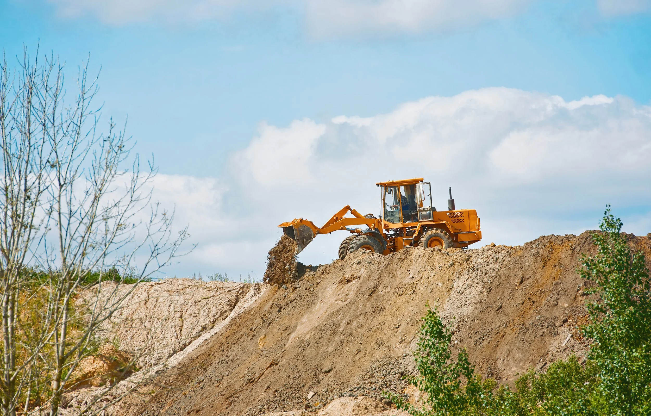 A yellow excavator working in a dirt area with green trees and hills in the background under a clear blue sky.